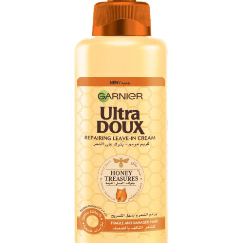 La crème sans rinçage Garnier Ultra Doux Trésors de Miel associe : Gelée royale réparatrice connue pour ses propriétés reconstituantes, propolis protectrice, un véritable ciment naturel créé par les abeilles, et miel nourrissant, nectar millénaire reconnu laissant le cheveu léger, doux et souple.