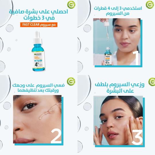 Nouveau Garnier Fast Clear Anti Acne Booster Serum alimenté avec 4% de vitamine C + Salicyclique + Niacinamide + AHA, aide à combattre l’acné et à estomper les taches brunes. La peau est apaisée, visiblement plus lumineuse et plus nette.
